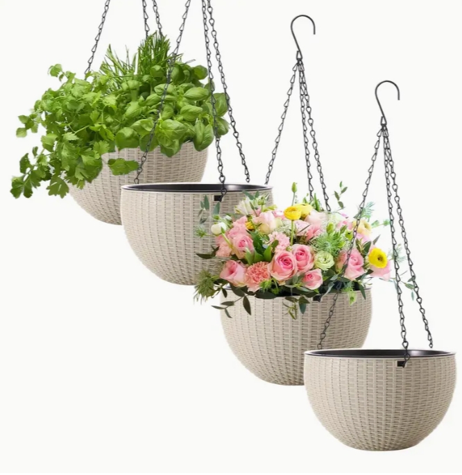 กระถางพลาสติกลายหวายพร้อมช่องระบายน้ำและตะขอแขวน
