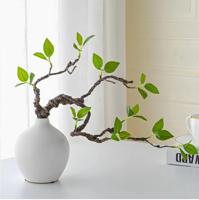 กิ่งไม้ฟิกัสเทียมที่เหมือนจริงในแจกันเซรามิกสีขาว
